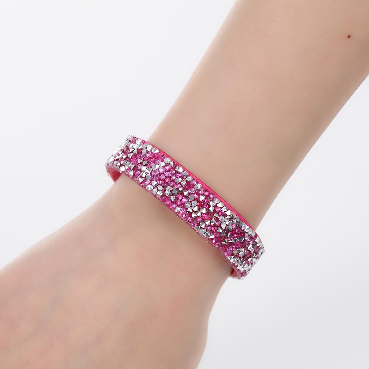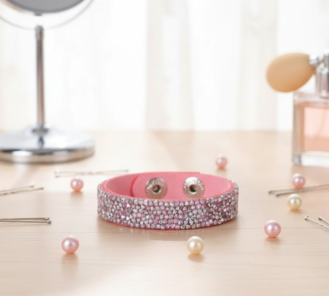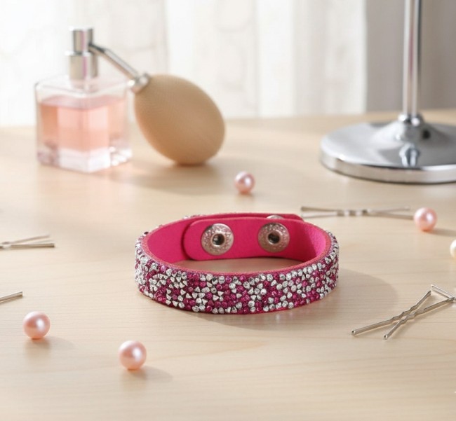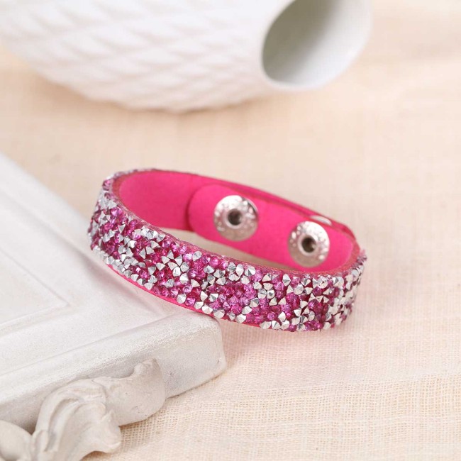 * Détail : bracelet sur cordon suédine fuchsia avec strass , fermeture facile grâce à 2 boutons pression