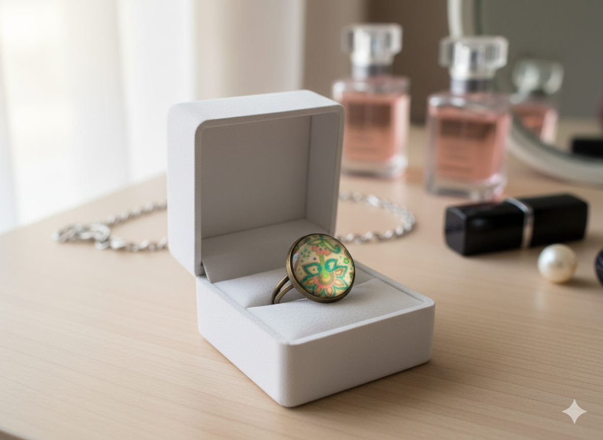 Bague anneaux bronze réglables avec un cabochon verre 16 mm imprimé motifs aztèques