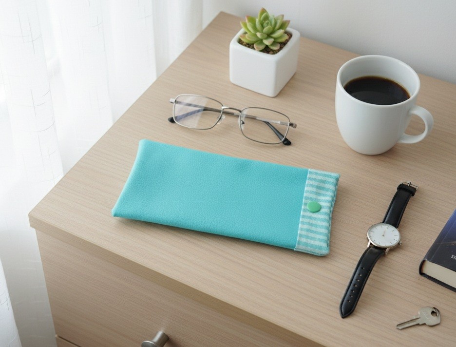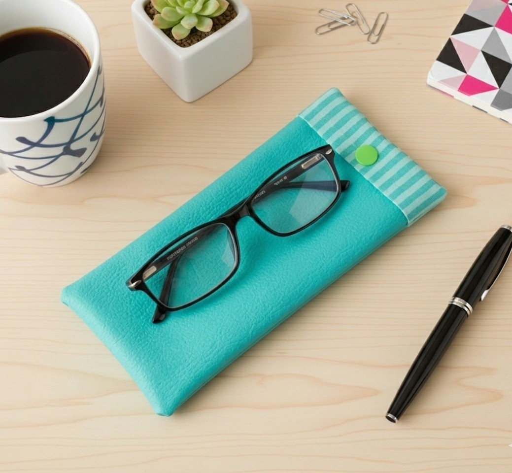 Étui pour lunette simili cuir vert turquoise et doublé en tissus coton à rayures.