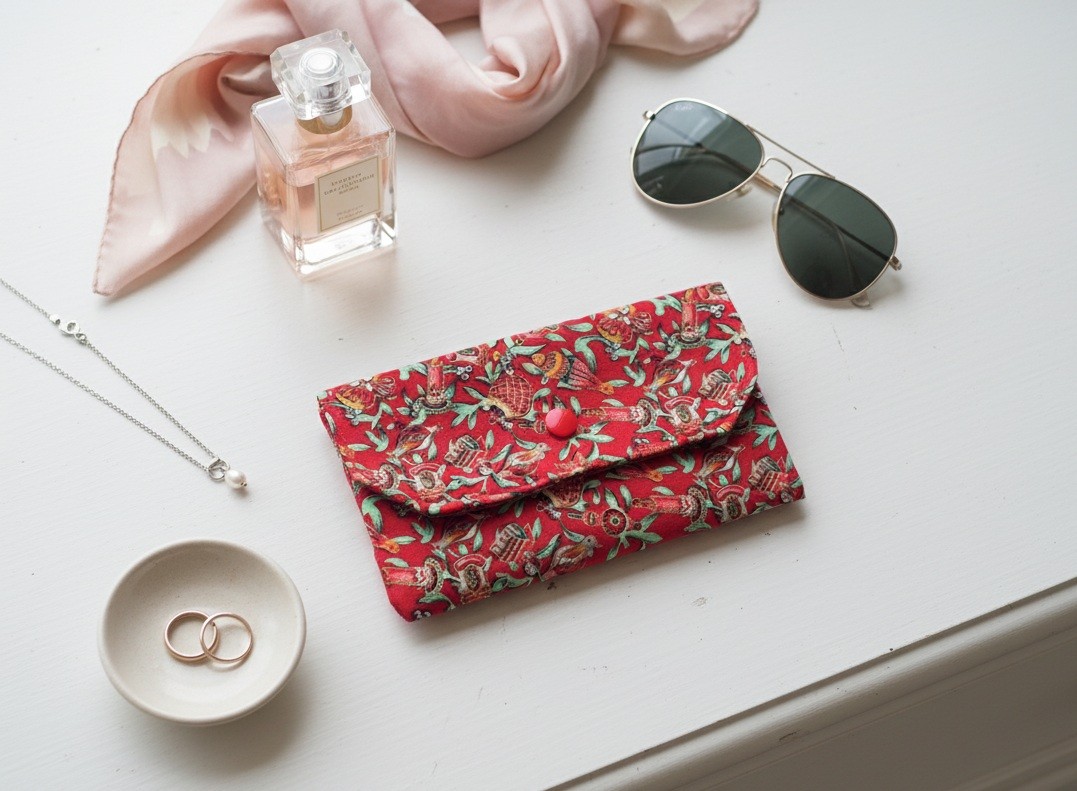Jolie petite pochette tissu coton doublée. Le tissus est rouge et à motifs . Fermeture bouton pression. Fait mains