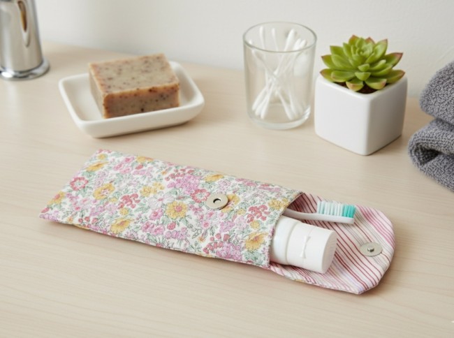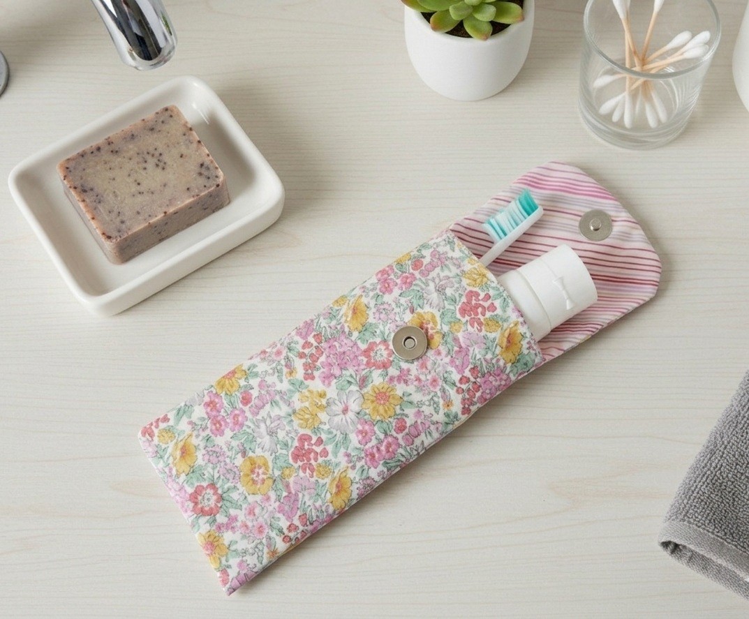 Emportez en voyage votre brosse à dents et votre dentifrice dans cet étui. L'intérieur est en tissu coton à rayures et le tissu principal motifs fleurs. Les tissus sont certifié Oeko-Tex.