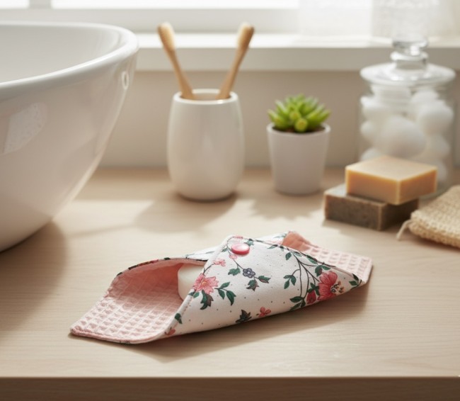 Très jolie pochette à savon ou shampoing solide qui se ferme à l’aide d’un bouton pression.