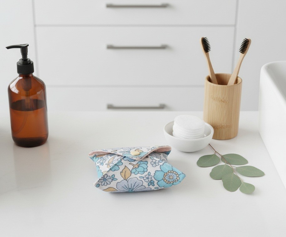 Fait mains : jolie petite pochette à savon fait en tissu nid d'abeilles de couleur saumon pour la doublure et un tissu coton fond blanc et motif fleurs bleues. Se replie et se ferme par un bouton pression résine de couleur beige.
