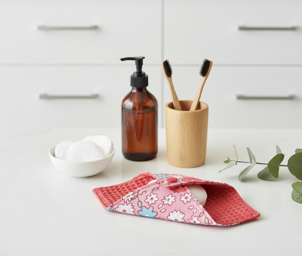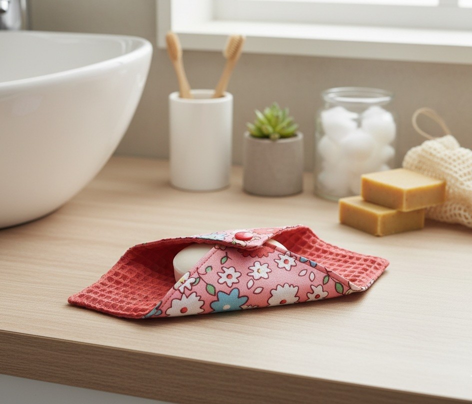 Très jolie pochette à savon ou shampoing solide qui se ferme à l’aide d’un bouton pression.