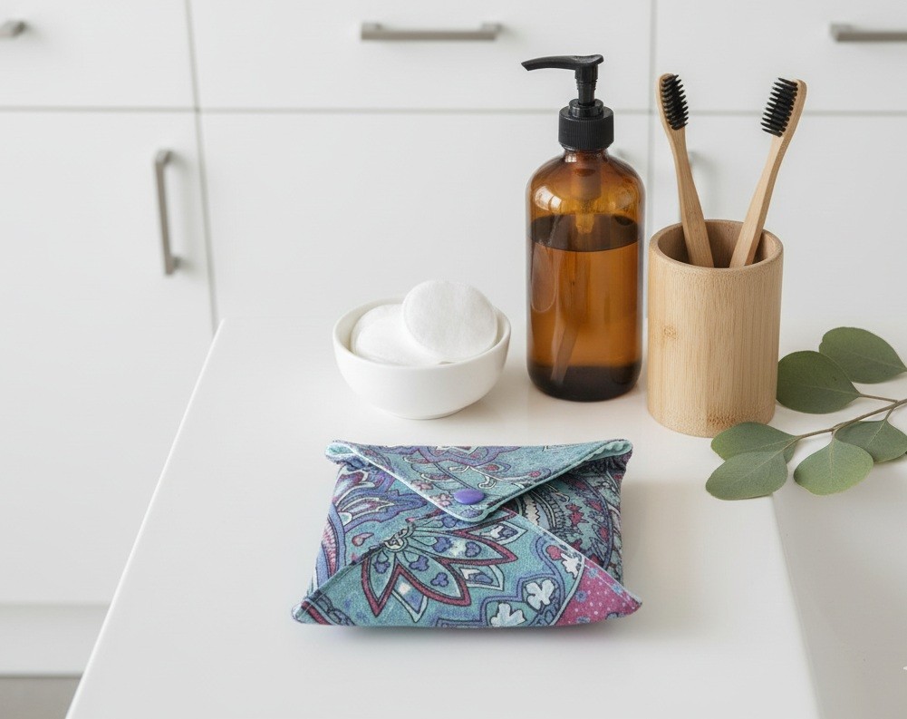 Fait mains : jolie petite pochette à savon fait en tissu nid d'abeille de couleur bleu ciel pour la doublure et un tissu coton motif imprimé. Se replie et se ferme par un bouton pression résine de couleur mauve.
