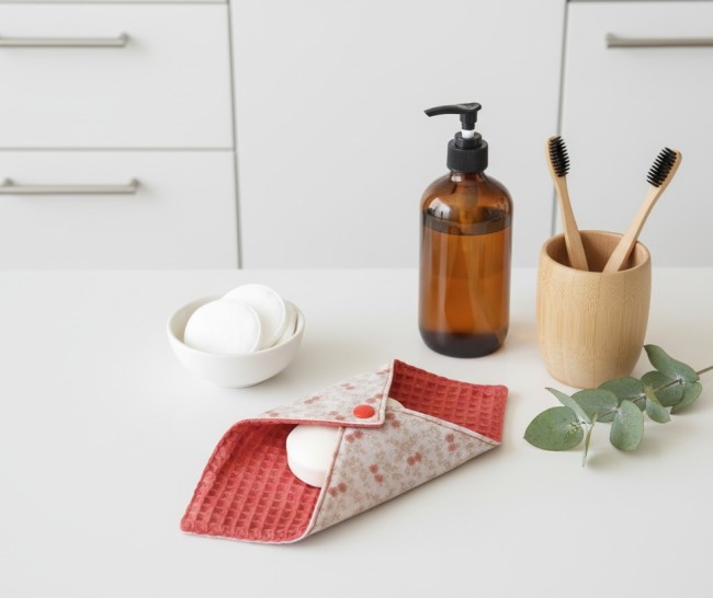 Très jolie pochette à savon ou shampoing solide qui se ferme à l’aide d’un bouton pression.