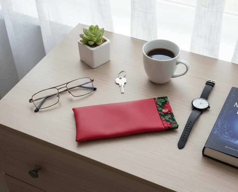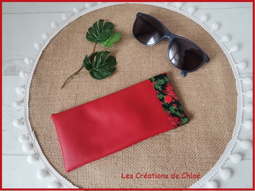 Etui à lunette en simili cuir rouge et tissus motif fleurs