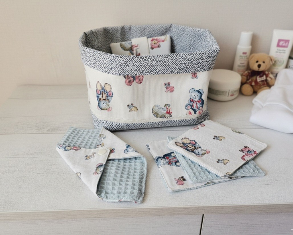Coffre naissance composé d'un petit panier pour y ranger les produits lavants pour bébé ou des couches, 1 pochette à savon doublé en tissus nid d'abeilles et fermée par un bouton pression, 10 lingettes coton doublé nid d'abeilles, 1 pochette à lingettes, 1 petite bourse pour tétine.