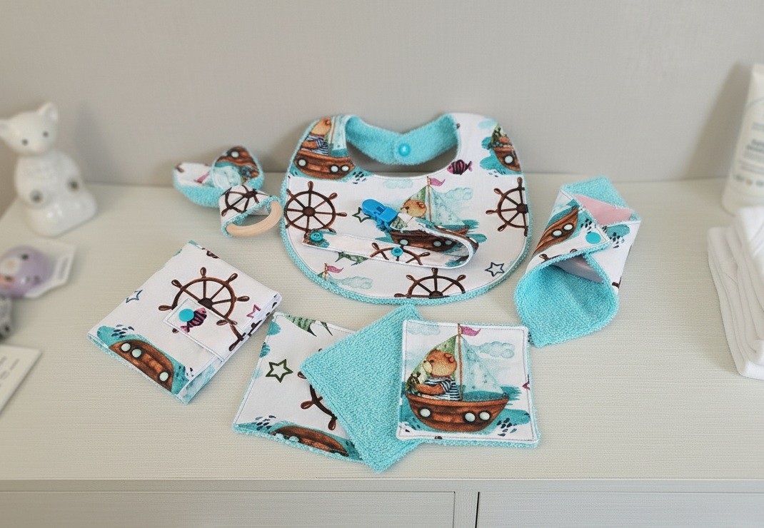 Coffret naissance composé d'un bavoir doublé éponge, d'une pochette à savon doublé en tissus éponge et fermée par un bouton pression , 6 lingettes coton doublé éponge, 1 pochette à lingettes refermable grâce à un bouton pression, 1 attache tétine et un hochet avec anneau de dentition en bois naturel