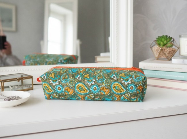 Trousse fourre tout (écolier, maquillage ou autre) en tissus coton motifs imprimé doublure tissus orange clair.