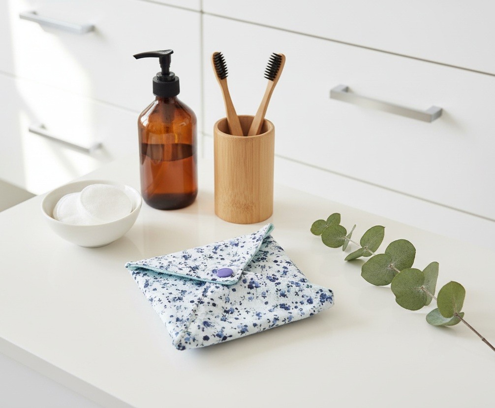 Fait mains : jolie petite pochette à savon fait en tissu nid d'abeille de couleur bleu ciel pour la doublure et un tissu coton à motifs fleur violettes . Se replie et se ferme par un bouton pression résine de couleur violet.