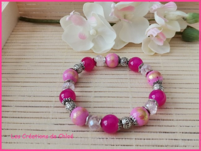 5 perles jade rose taches dorées 10 mm