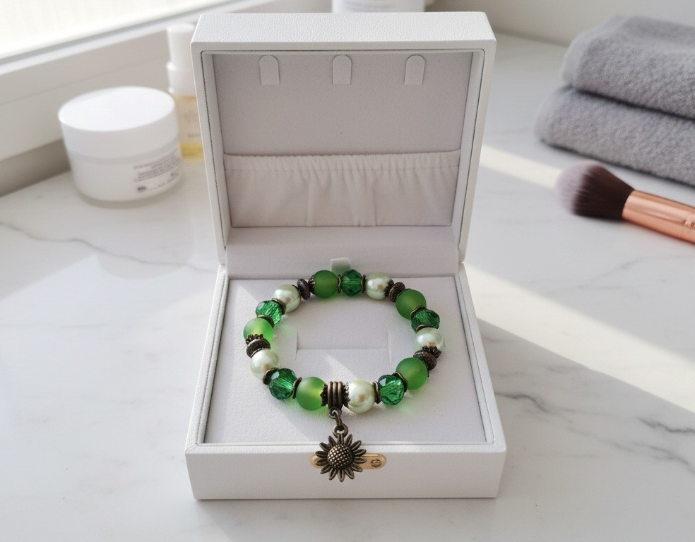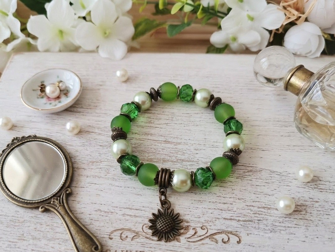 * Détail : bracelet sur fil élastique avec perles en verre givré verte de 10 mm, perles en verre nacré vert pale de 10 mm, perles à facette verte transparente de 10 mm avec apprêts de couleur bronze et breloque métal en forme de fleur de tournesol