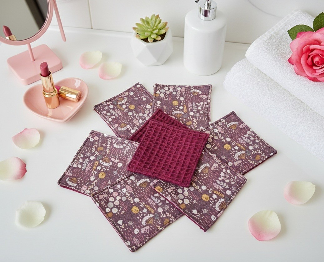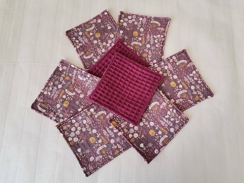 Lot de 8 lingettes démaquillantes coton imprimé fleur et nid d'abeilles violet