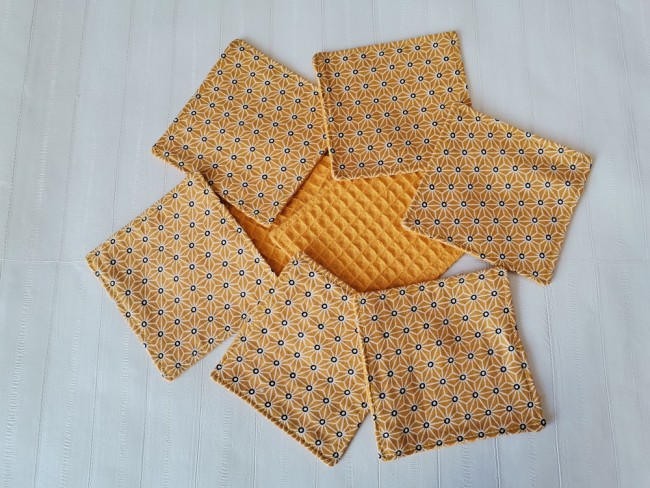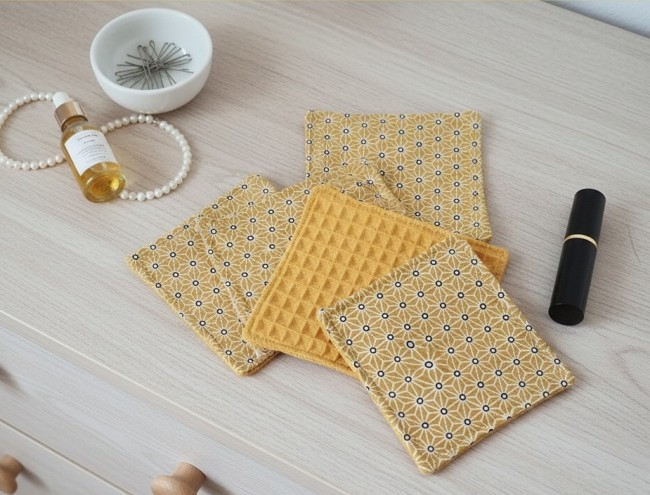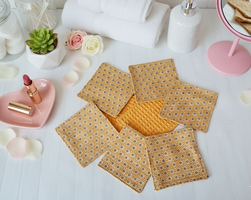Lot de 8 lingettes démaquillantes coton imprimé et nid d'abeilles moutarde