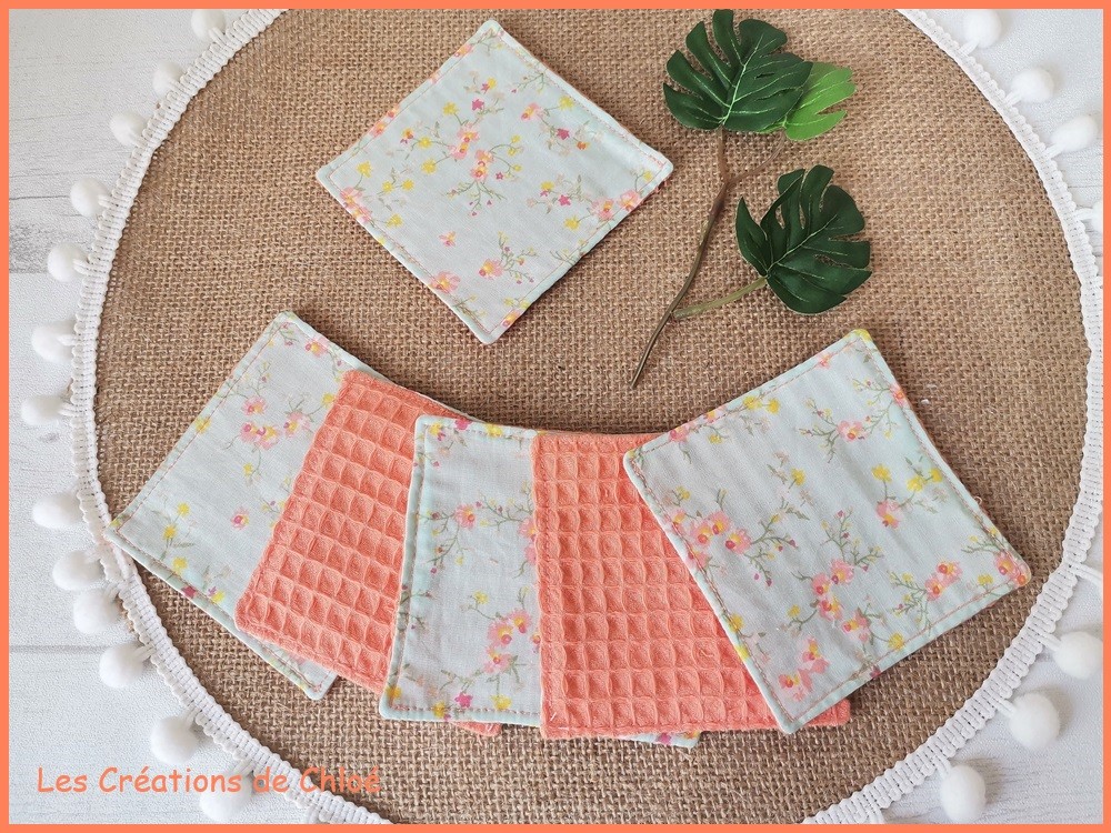 Lot de 8 lingettes démaquillantes coton imprimé fleurs et nid d'abeilles orange