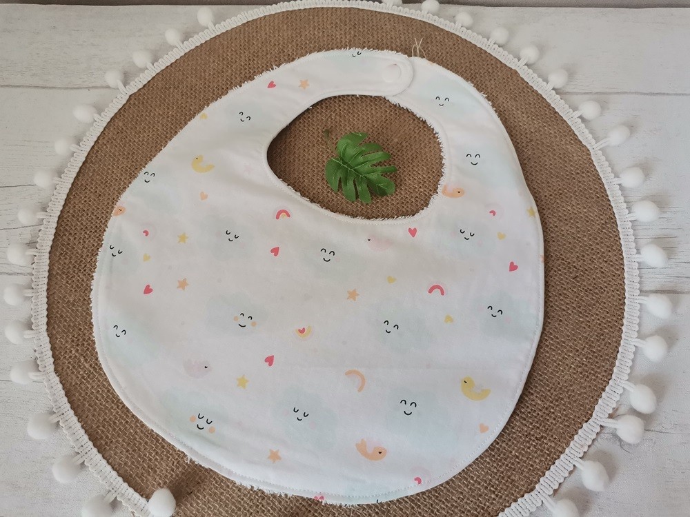 Ce joli petit bavoir se ferme par un bouton pression en résine de couleur blanche