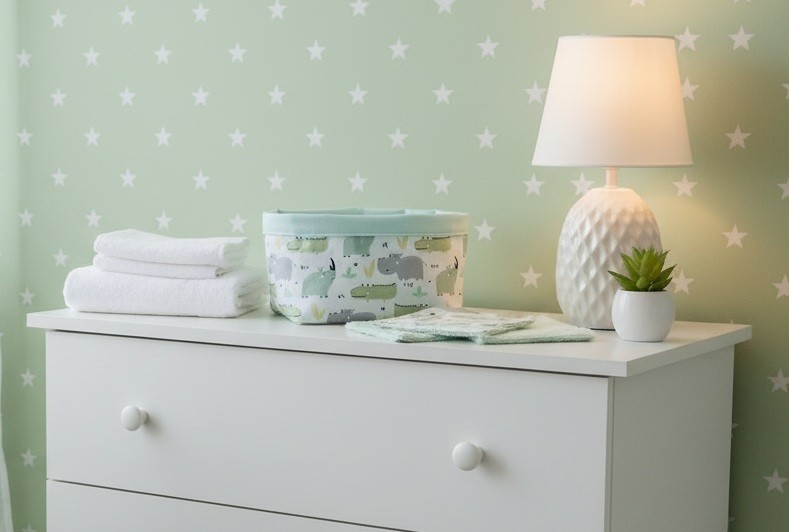 Une face en coton imprimé certifié Oeko-Tex et une face en éponge bambou de couleur vert pale