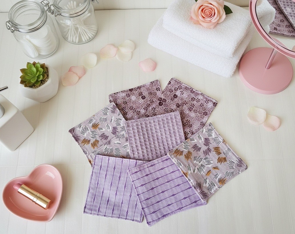 Lot de 12 lingettes démaquillantes pour femmes ton violet mauve avec 3 motifs différents