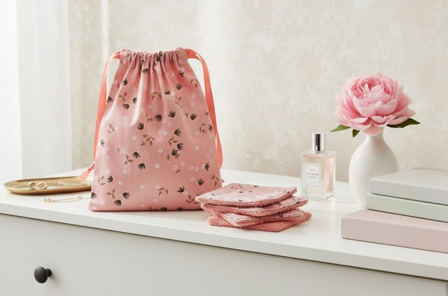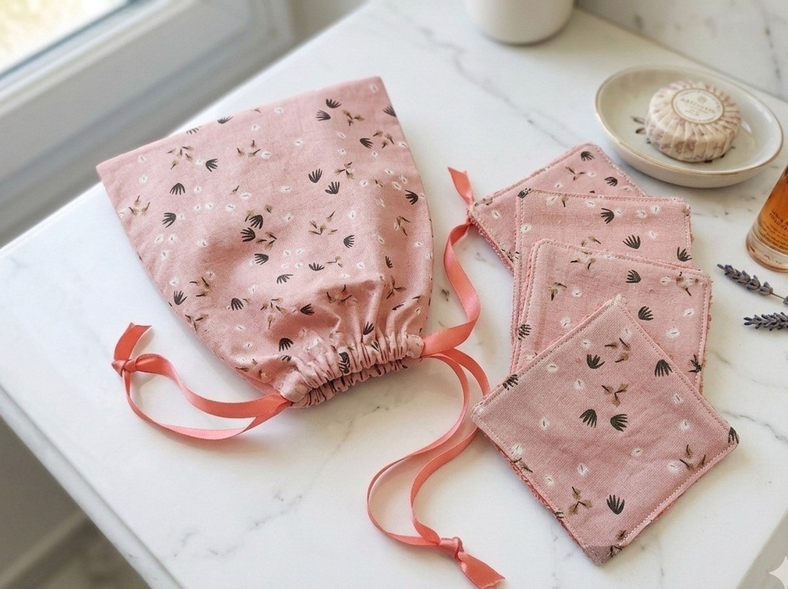 Lot de 8 lingettes démaquillantes et leur pochon assorti saumon