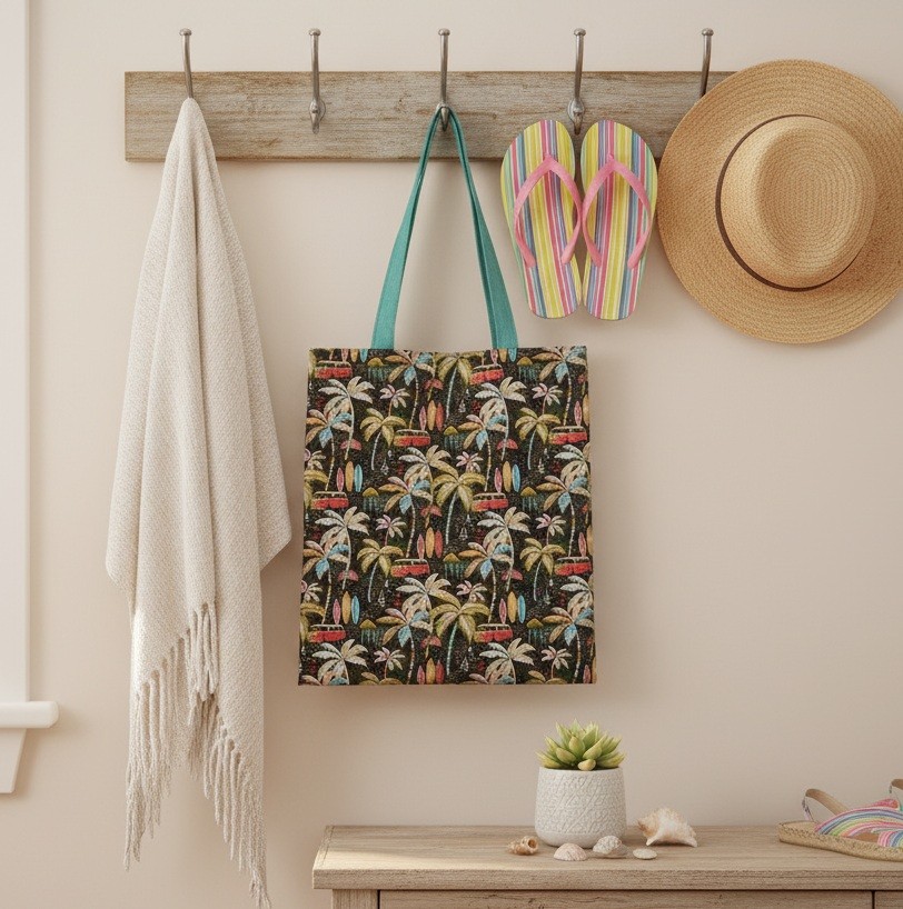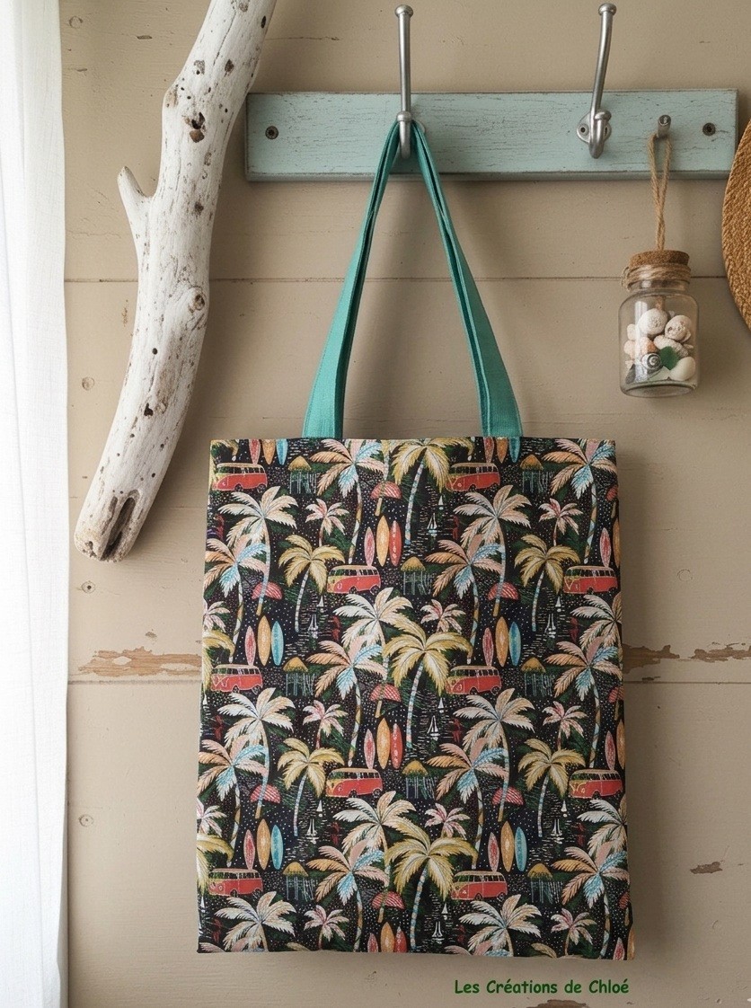 Confectionné dans un tissu coton certifié Oeko-Tex de couleur noir et motifs palmiers et planches de surf, doublé d'un tissu coton turquoise identique à la anse