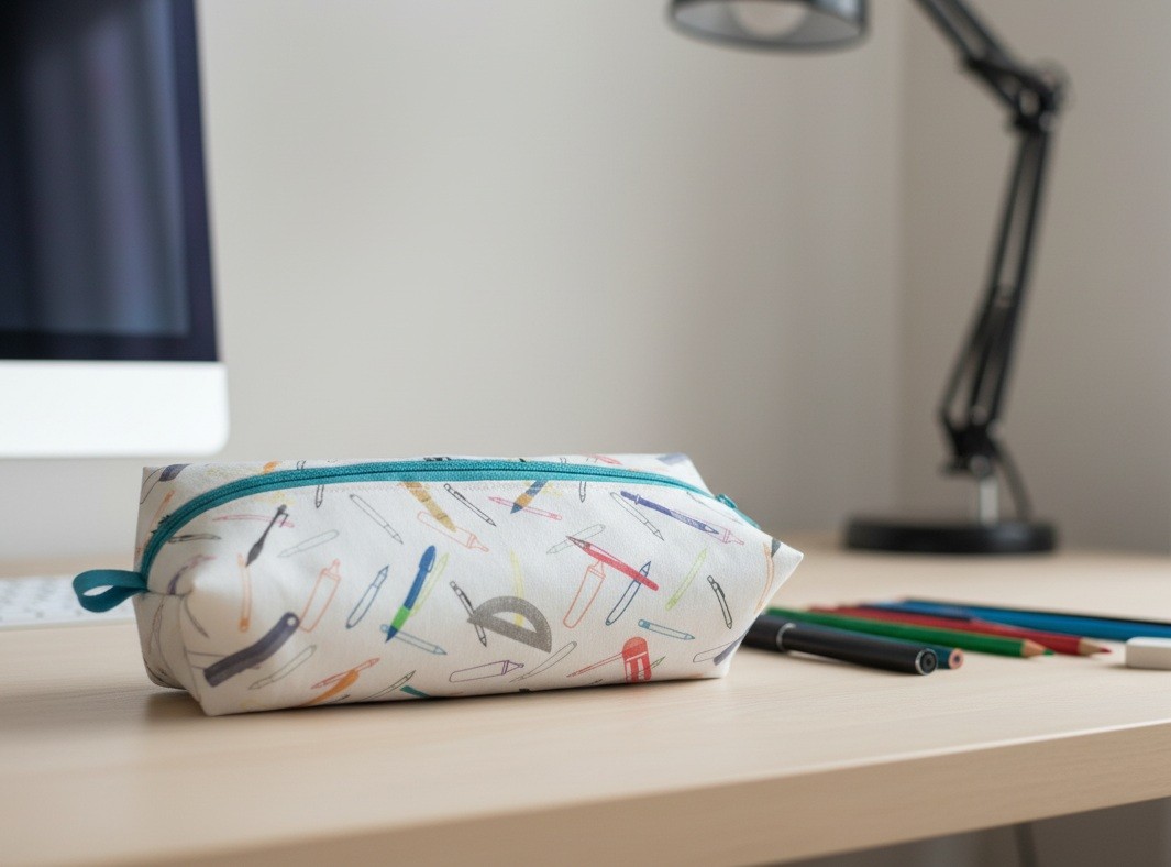 Trousse écolier en tissus coton certifié Oeko-Tex de couleur blanche motifs fournitures scolaires doublure tissus vert .