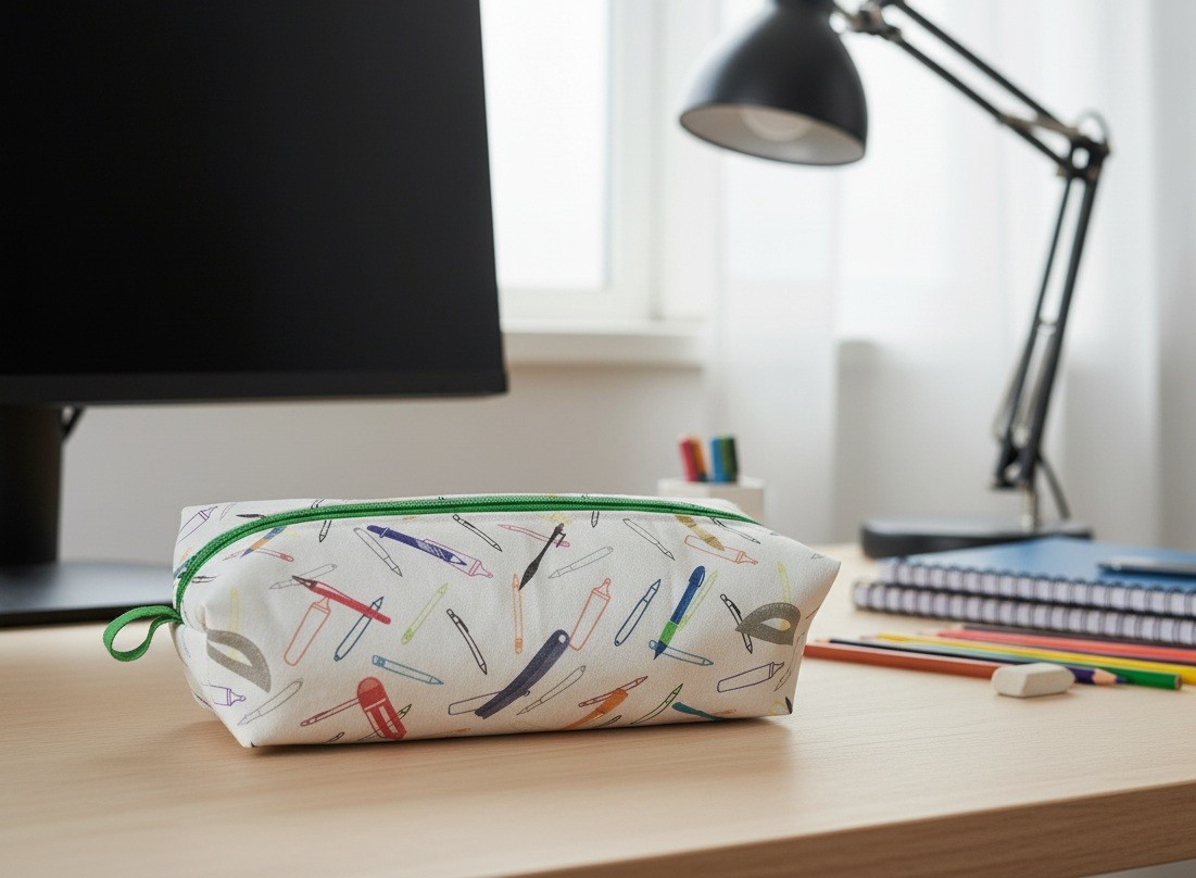 Trousse écolier en tissus coton certifié Oeko-Tex de couleur blanche motifs fournitures scolaires doublure tissus polyester de couleur vert et blanc .