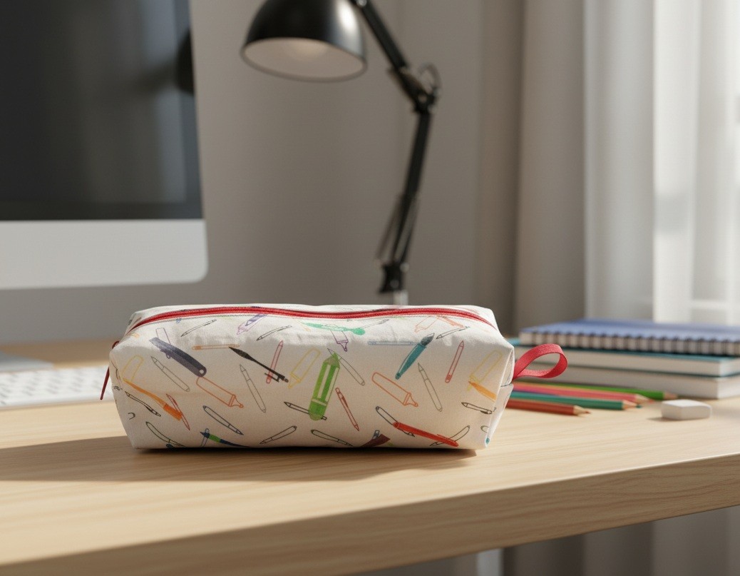 Trousse écolier en tissus coton certifié Oeko-Tex de couleur blanche motifs fournitures scolaires doublure tissus polyester de couleur blanche .