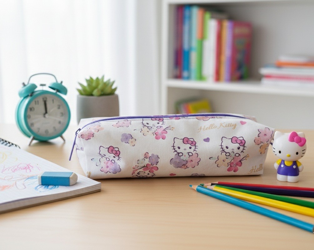 Trousse zippée en coton certifié Oeko-Tex motif Hello Kitty sur fond blanc intérieur doublé d'un tissu polyester de couleur rose et motif fleur - Entoilage de renfort pour le tissu principal - Fermeture zippée de couleur violet avec petite dragonne