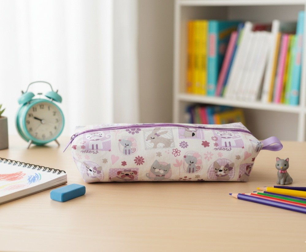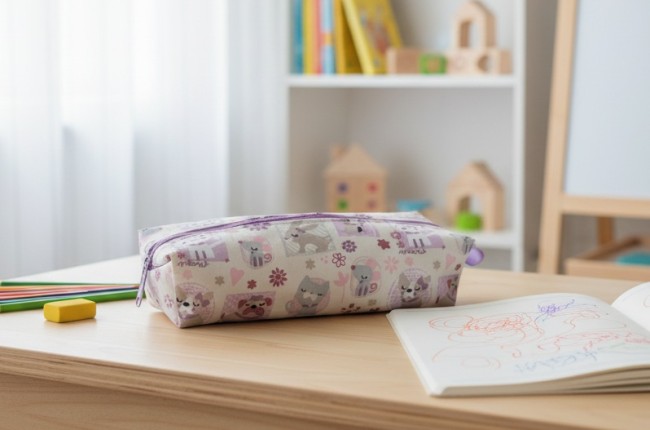 Trousse zippée en coton certifié Oeko-Tex motif animaux sur fond beige intérieur doublé d'un tissu polyester de couleur blanche et rose - Entoilage de renfort pour le tissu principal - Fermeture zippée de couleur lilas avec petite dragonne