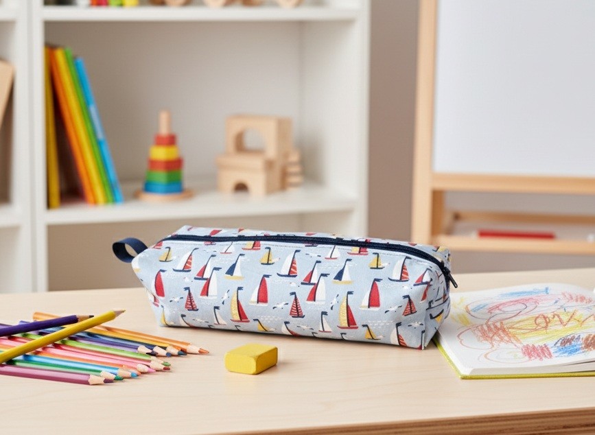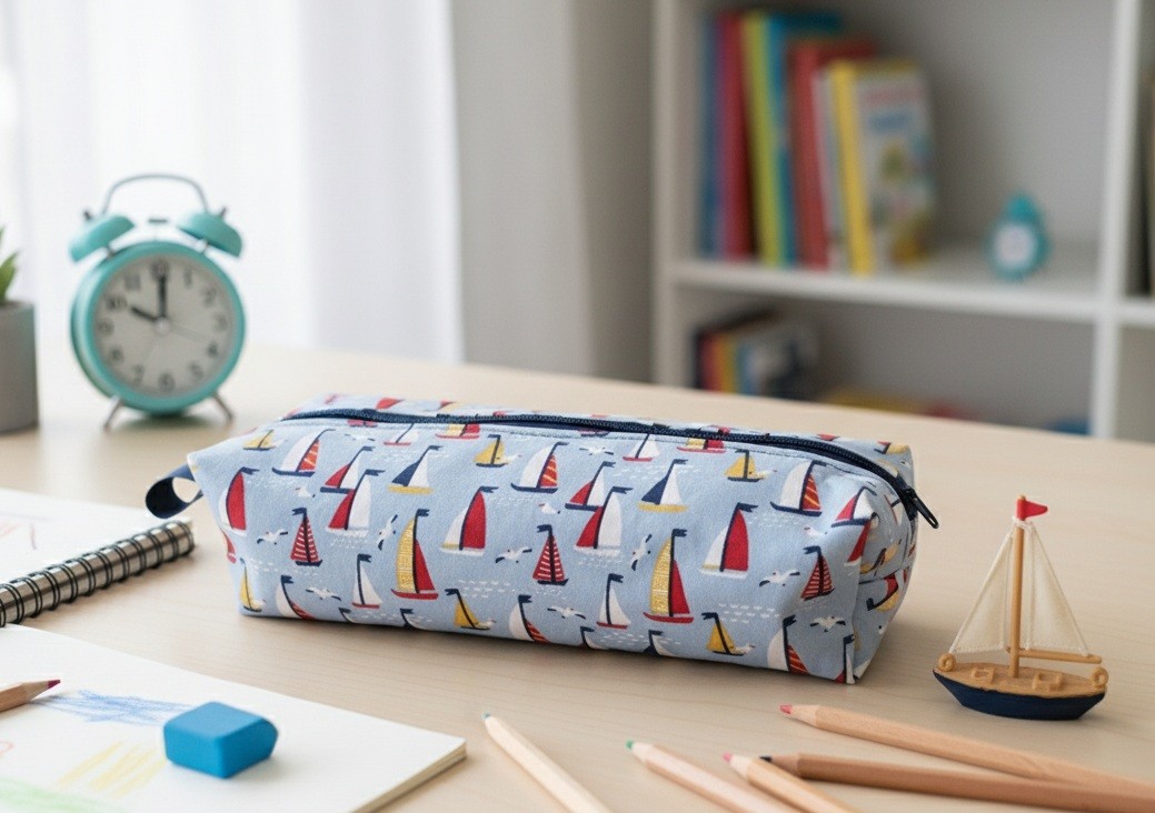 Trousse zippée en coton certifié Oeko-Tex motif petits bateaux sur fond couleur bleue intérieur doublé d'un tissu polyester de couleur bleu pois blancs - Entoilage de renfort pour le tissu principal - Fermeture zippée de couleur bleu marine avec petite dragonne
