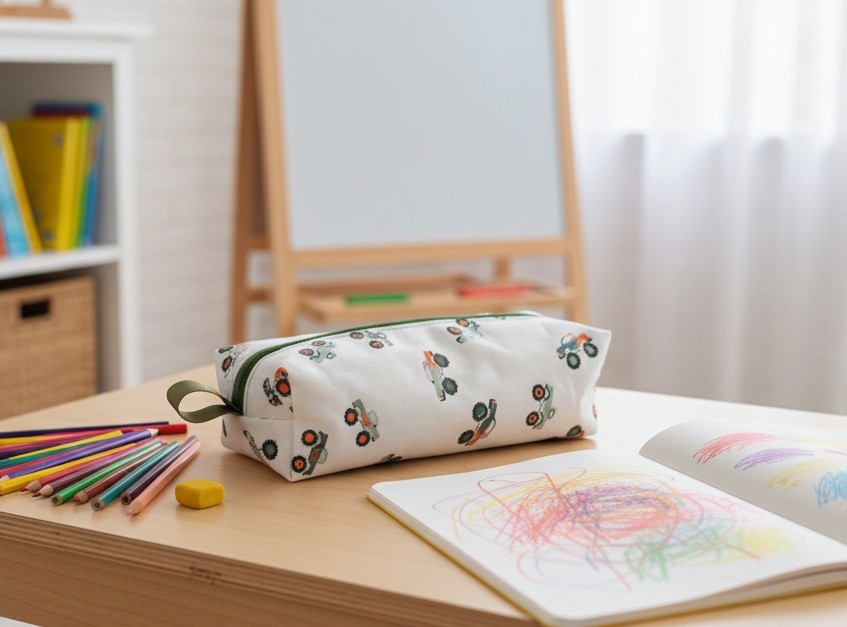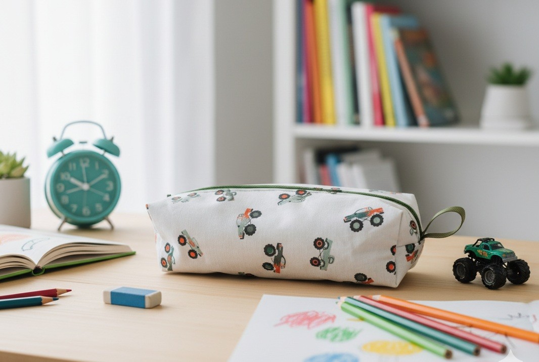 Trousse zippée en coton certifié Oeko-Tex motif véhicules grosses roues sur fond couleur beige intérieur doublé d'un tissu polyester de couleur vert à rayures - Entoilage de renfort pour le tissu principal - Fermeture zippée de couleur vert olive avec petite dragonne