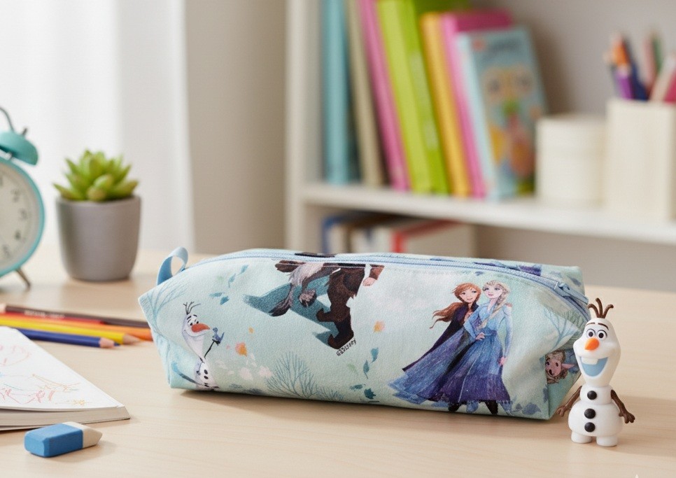 Trousse zippée en coton certifié Oeko-Tex motif reine des neiges sur fond bleu intérieur doublé d'un tissu polyester de couleur bleu et motif fleur - Entoilage de renfort pour le tissu principal - Fermeture zippée de couleur bleu ciel avec petite dragonne