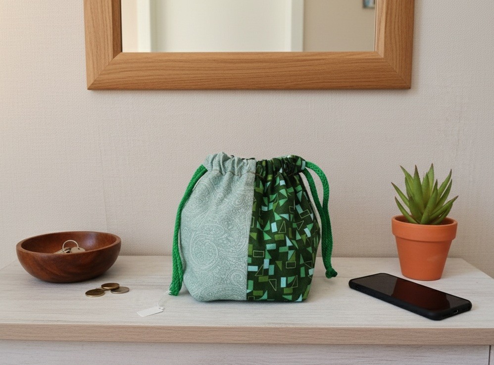 Pochon en coton imprimé et uni certifié Oeko-Tex avec doublure coton uni. Fermeture par un cordon coulissant de couleur vert.