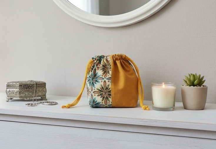 Pochon en coton imprimé fleurs et uni certifié Oeko-Tex avec doublure polyester Fermeture par un cordon coulissant de couleur jaune moutarde.