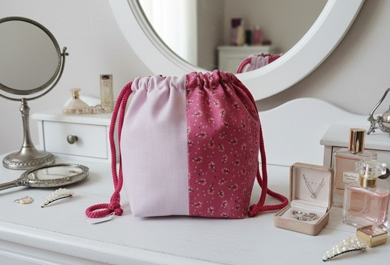 Pochon en coton imprimé et uni certifié Oeko-Tex avec doublure polyester Fermeture par un cordon coulissant de couleur rose foncé.