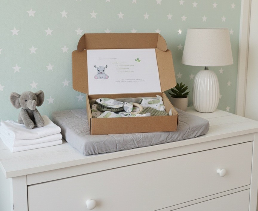 Coffret naissance/box naissance 6 lingettes kaki et motif hippopotames