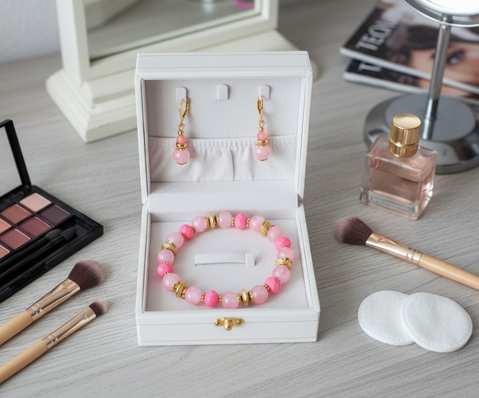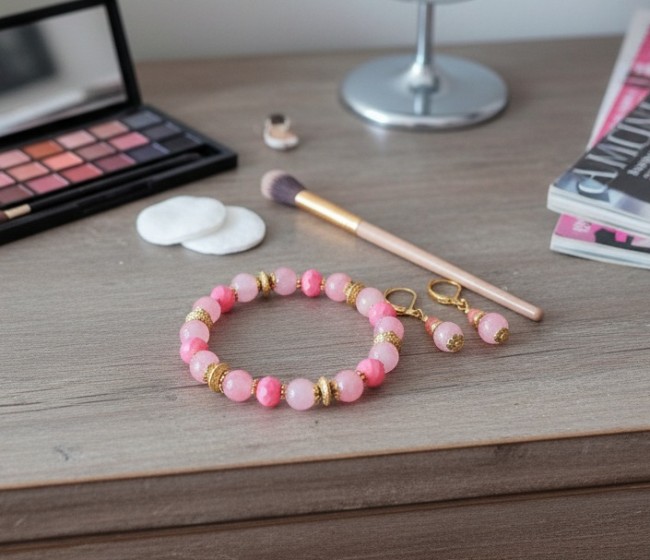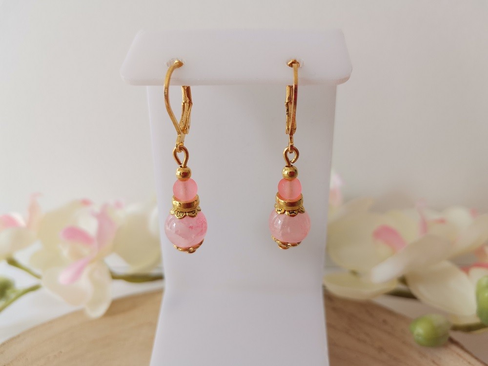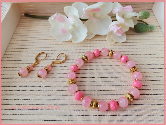 Jolie parure de bijoux composé d'un bracelet en perles de verre de 8 mm de couleur saumon avec les boucles d'oreilles assorties. Apprêts de couleur doré en alliage sans plomb et sans cadmium.