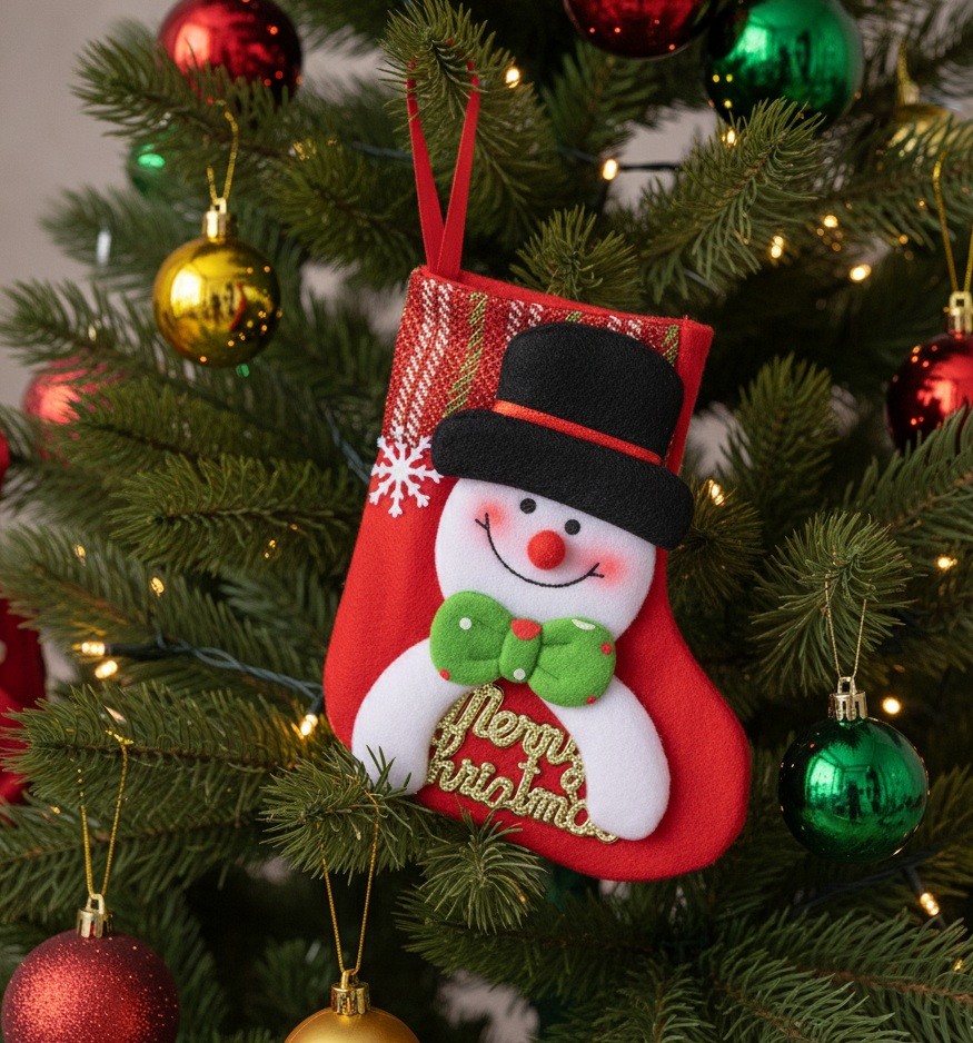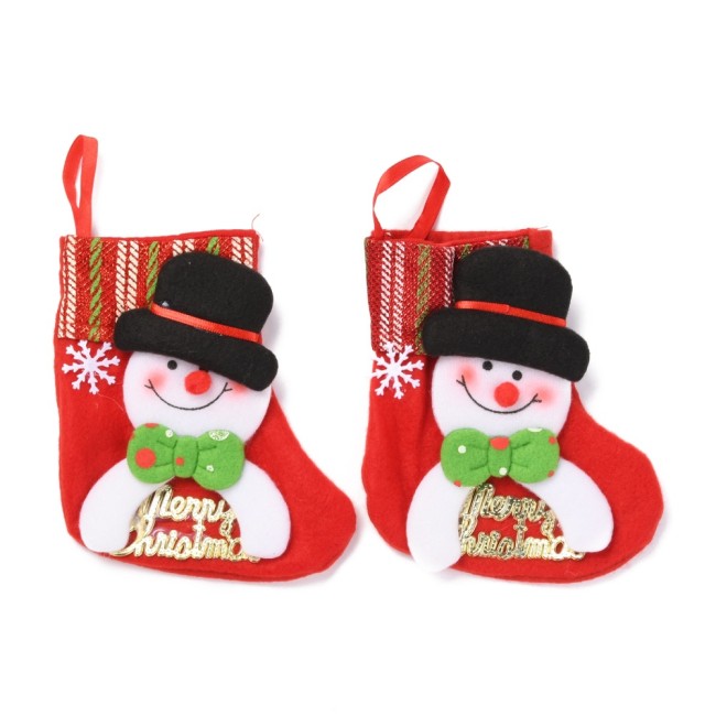 Joli petit pochon de noël en tissu pour suspendre dans le sapin ou sur la cheminée avec un motif bonhomme de neige et l'inscription Merry Christmas de couleur doré