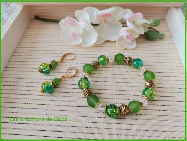 Jolie parure de bijoux composé d'un bracelet en perles de verre de 10 mm de couleur verte avec les boucles d'oreilles assorties. Apprêts de couleur doré en alliage sans plomb et sans cadmium.