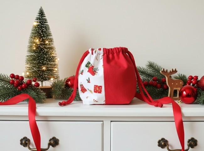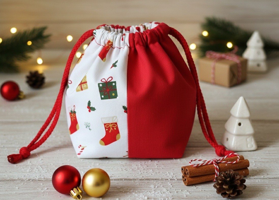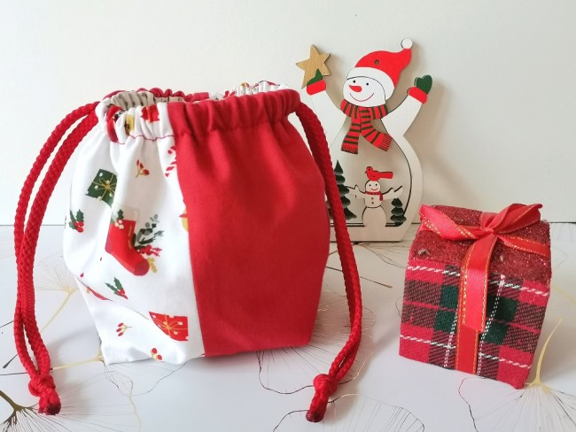 Petit sac pochon de noël à lien coulissant en tissus coton certifié Oeko-Tex imprimé motif noël et rouge