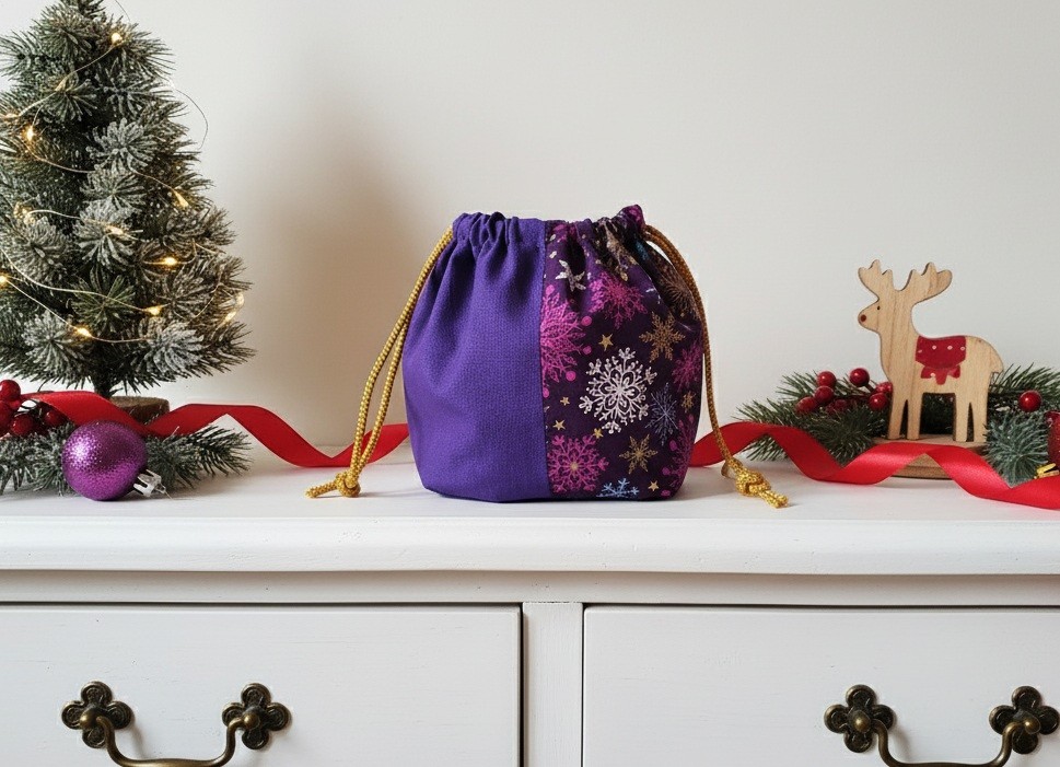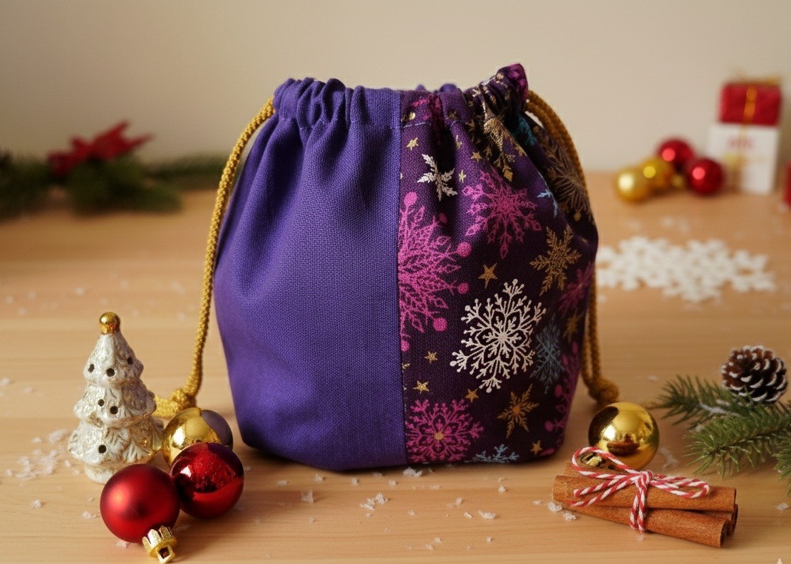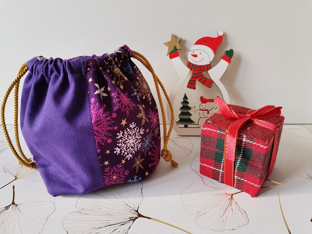 Petit sac pochon de noël à lien coulissant en tissus coton certifié Oeko-Tex imprimé motif noël et violet uni