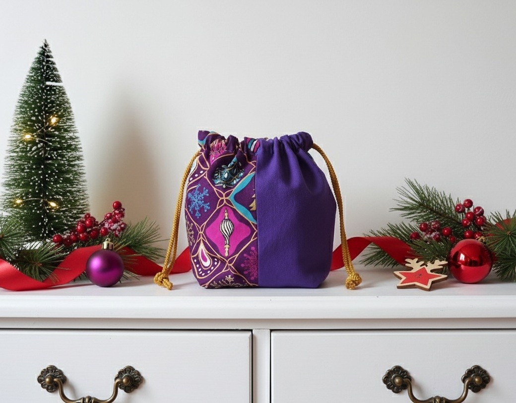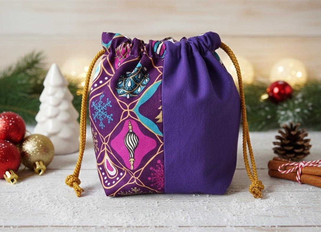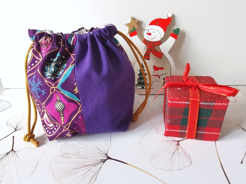 Petit sac pochon de noël à lien coulissant en tissus coton certifié Oeko-Tex imprimé motif noël et violet uni