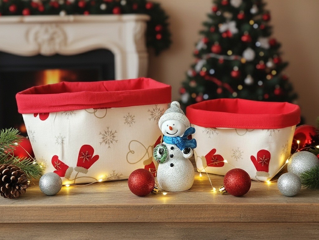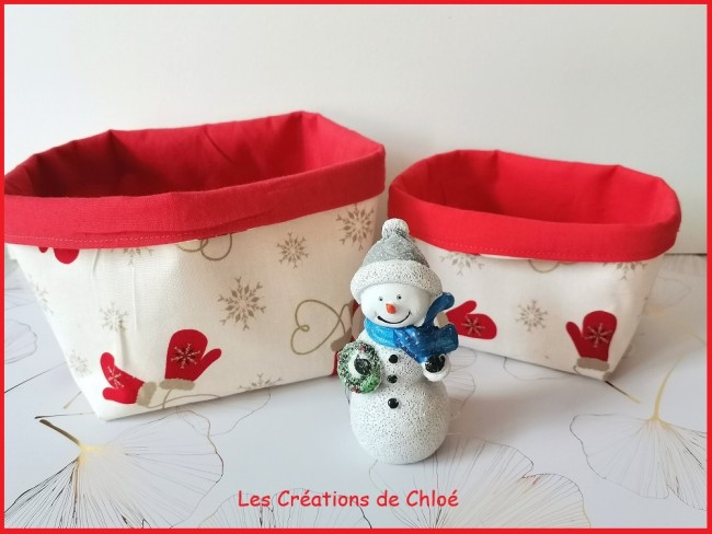 Petits paniers fait en tissus certifié Oeko-Tex de couleur beige et rouge avec pour motifs des mitaines de noël