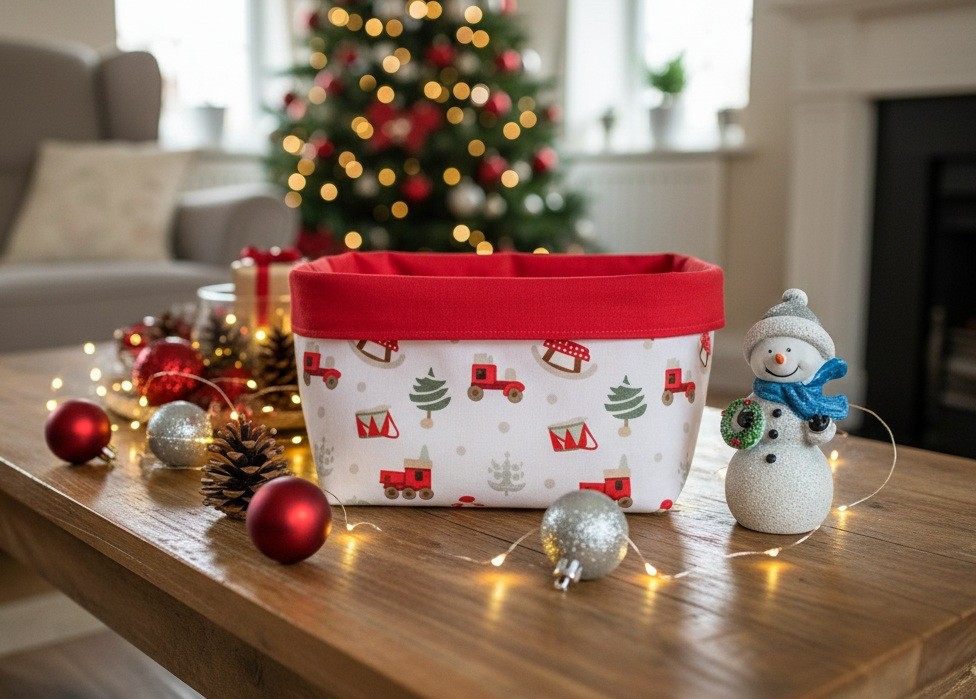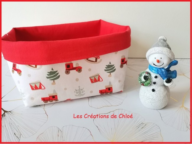 Petit panier fait en tissu certifié Oeko-Tex de couleur blanc à motifs jouets en bois de noël