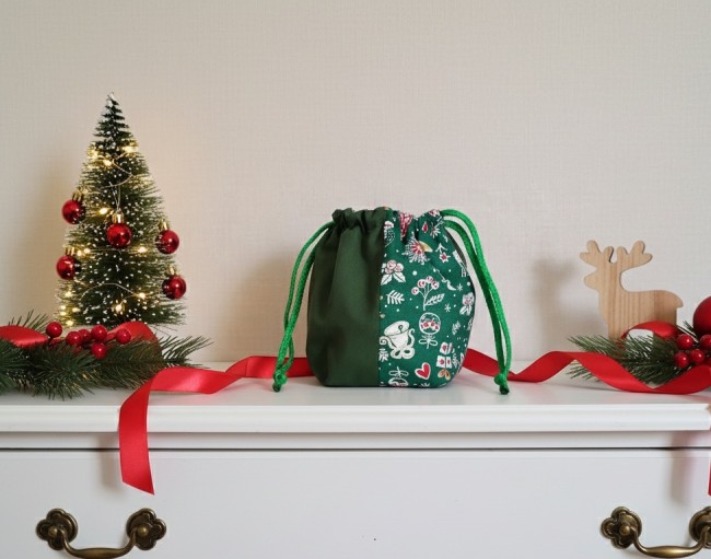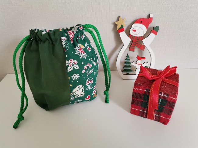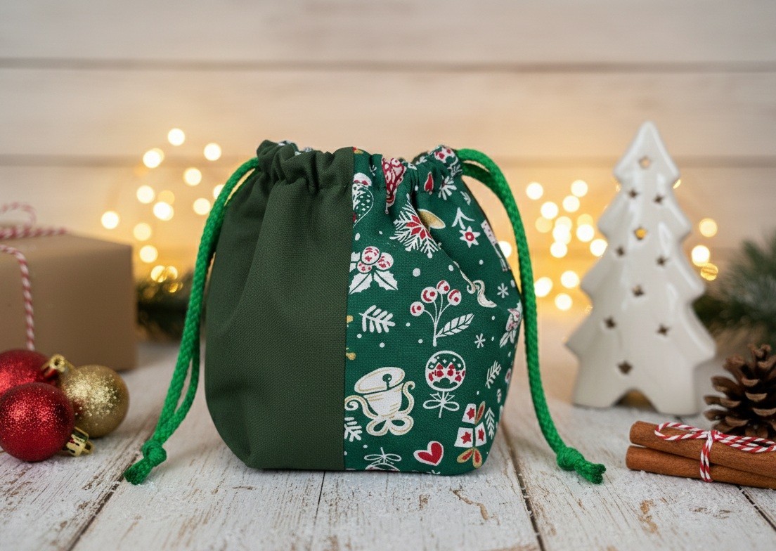Petit sac pochon de noël à lien coulissant en tissus coton certifié Oeko-Tex imprimé motif noël et vert uni