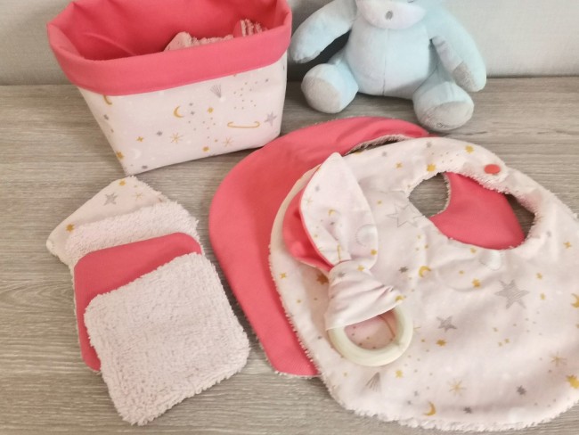 - 2 bavoirs bandana de 0 à 12 mois (1 tissu uni et 1 tissu motif étoiles).