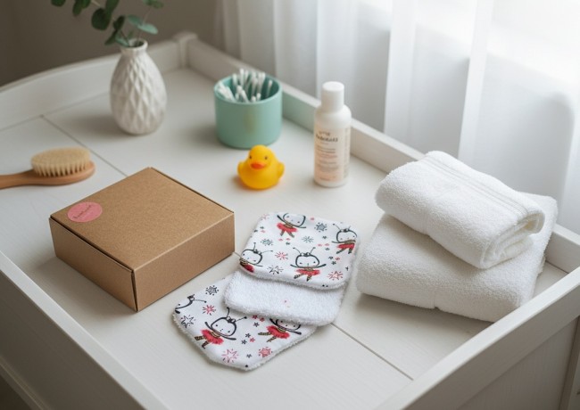Un peu de douceur pour le change de bébé avec cette jolie boite de 8 lingettes lavables