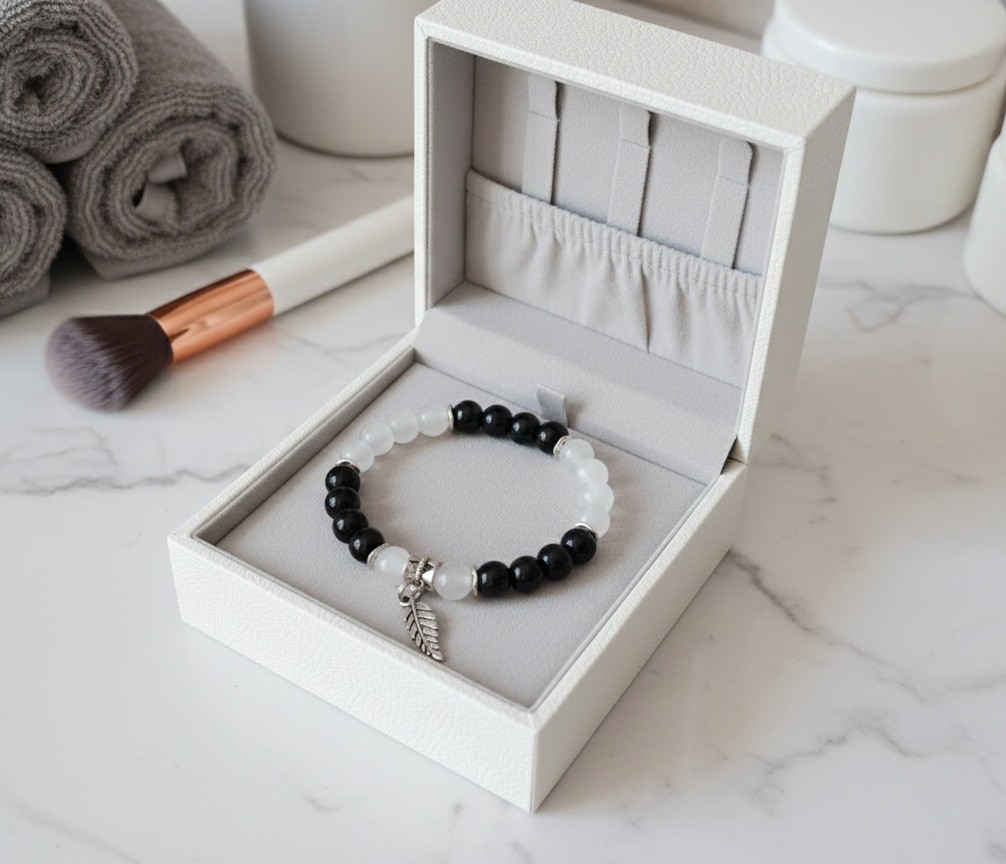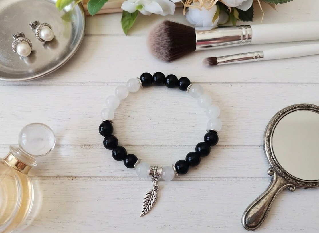 Bracelet sur fil élastique composé de perles en verre 8 mm noires et blanches transparentes, perles intercalaires métal ondulé et bélière avec breloque plume