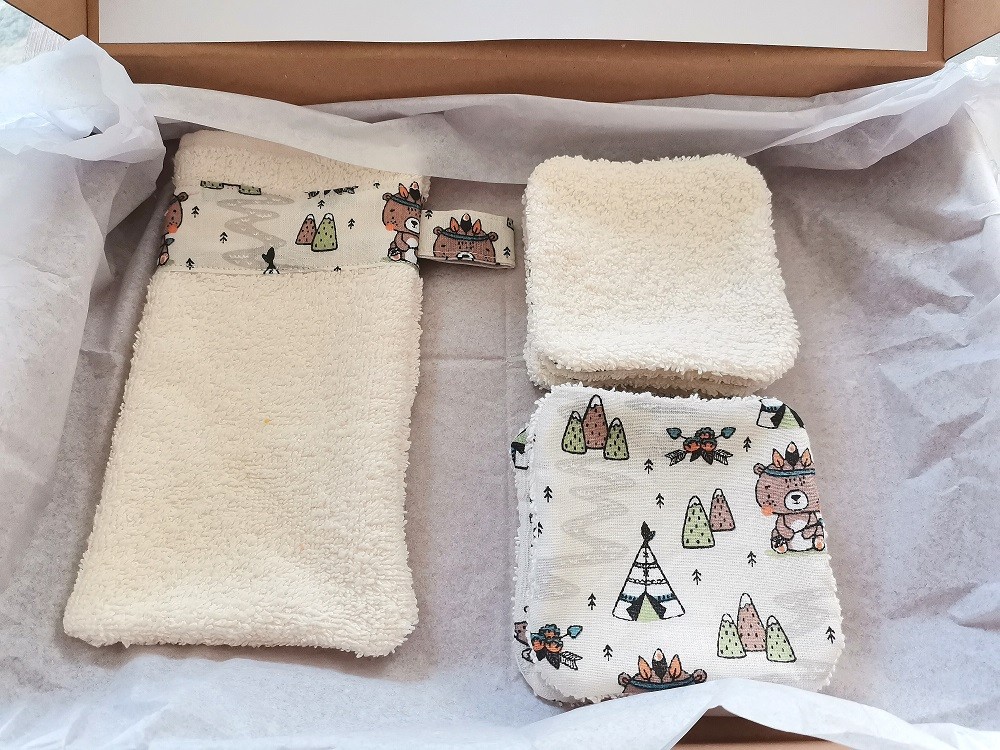 - huit lingettes toutes douces en coton certifié Oeko-Tex et éponge pour la toilette de bébé ( format 9 x 9 cm )